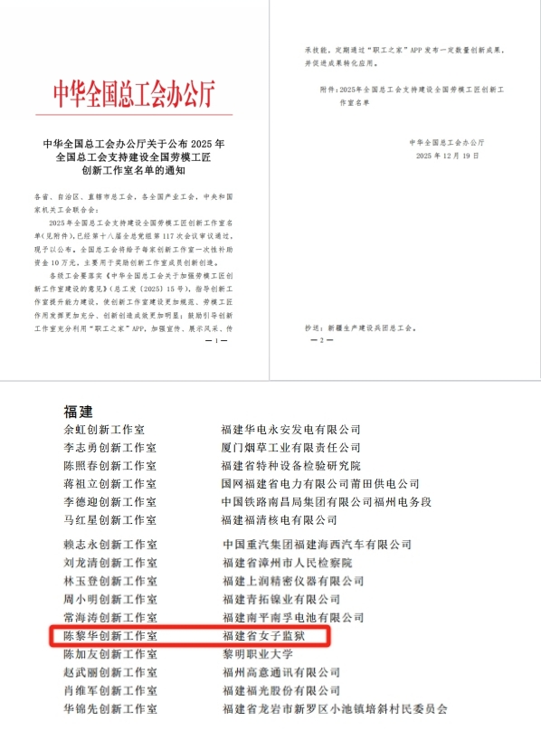 近日,中华全国总工会办公厅印发通知,正式公布2025年全国总工会支持建设全国劳模工匠创新工作室名单,福建省女子监狱陈黎华创新工作室光荣入选!这是全国监狱系统中唯一获此国家级殊荣的创新工作室,彰显了福建监狱系统在劳模工匠培育与创新实践领域的突出成果。