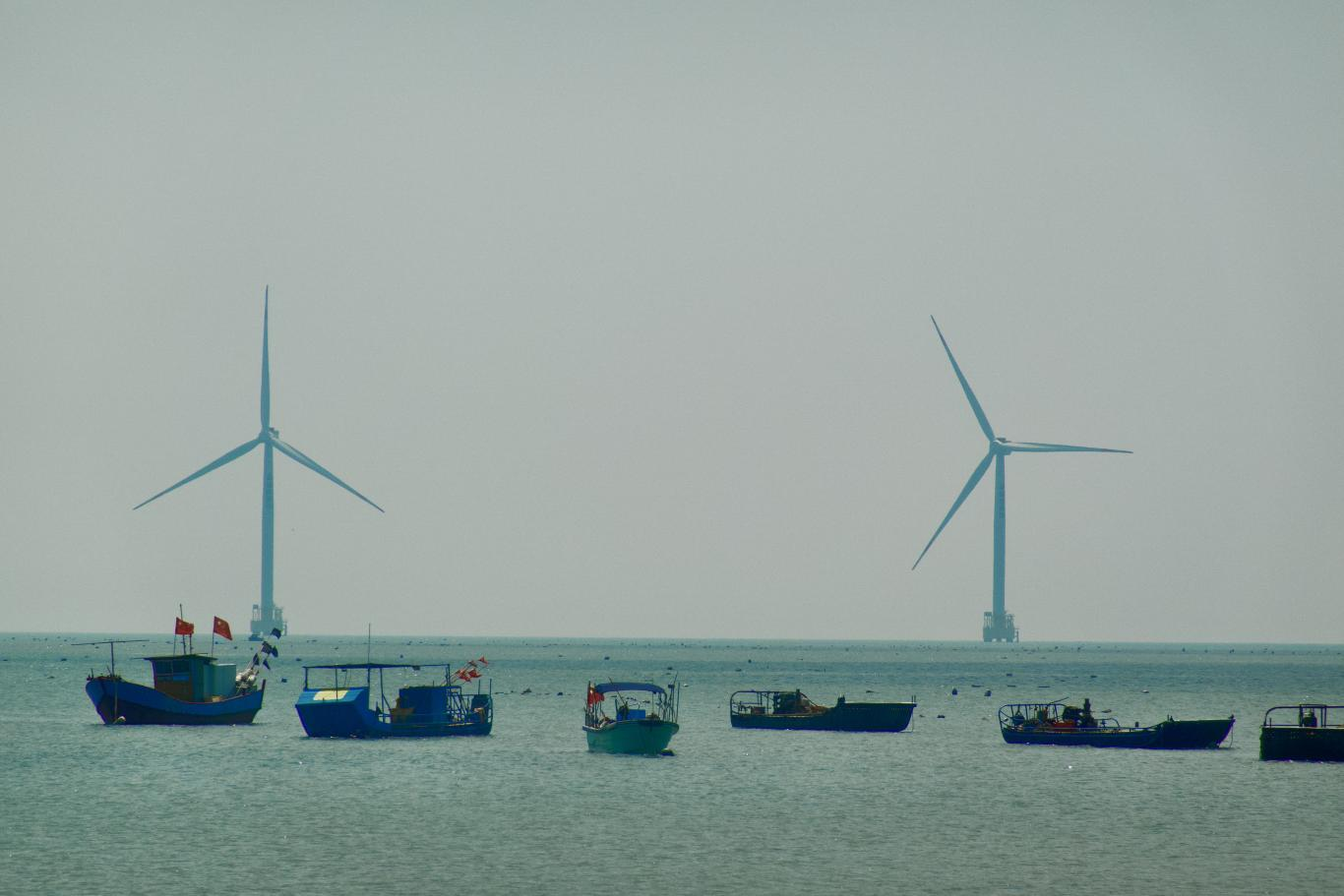 蓝盈盈的海面漾着轻波,几艘漆着靛蓝的渔船静泊其间,船桅上红旗轻晃,是渔家独有的鲜活点缀。远处海面立着两座洁白的风电塔筒,巨幅扇叶慢悠悠旋着,将海风揉进现代韵律里——传统渔舟与海上风电遥遥相对,像是海岛写给时光的诗,既有渔火炊烟的烟火气,又藏着追风逐电的新气息。