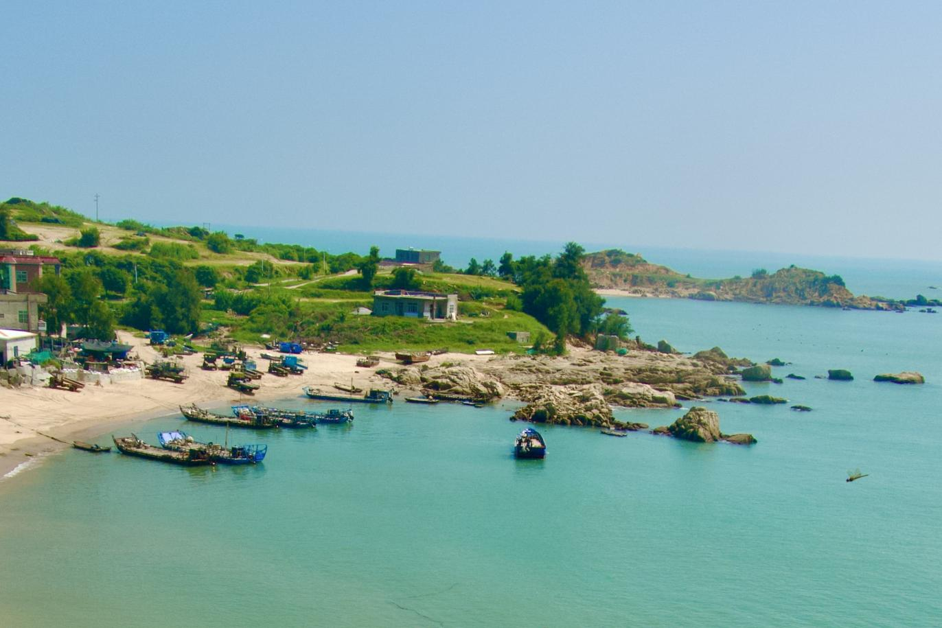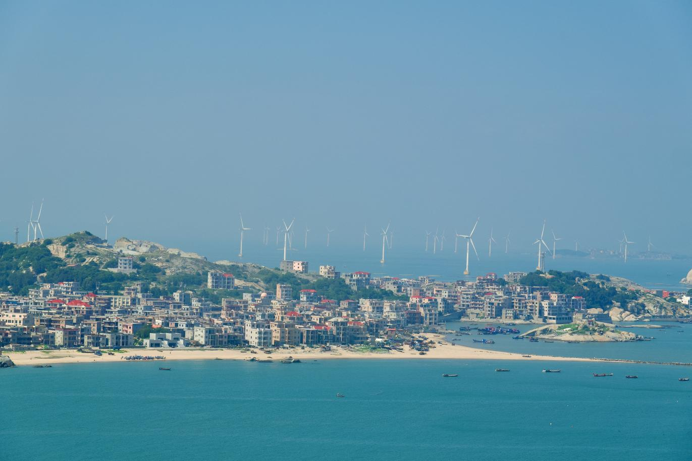 站在高处望,南日岛的风貌铺得开阔——成片的风电塔筒沿着海岸线排开,扇叶转得慢悠悠,像是给海岛安了个“追风的翅膀”。红顶白墙的村落嵌在坡地与沙滩间,房屋错落却透着烟火气,滩边渔船点点,海水蓝得透亮,现代风电群与渔家村落相融,是海岛独有的新烟火画卷。