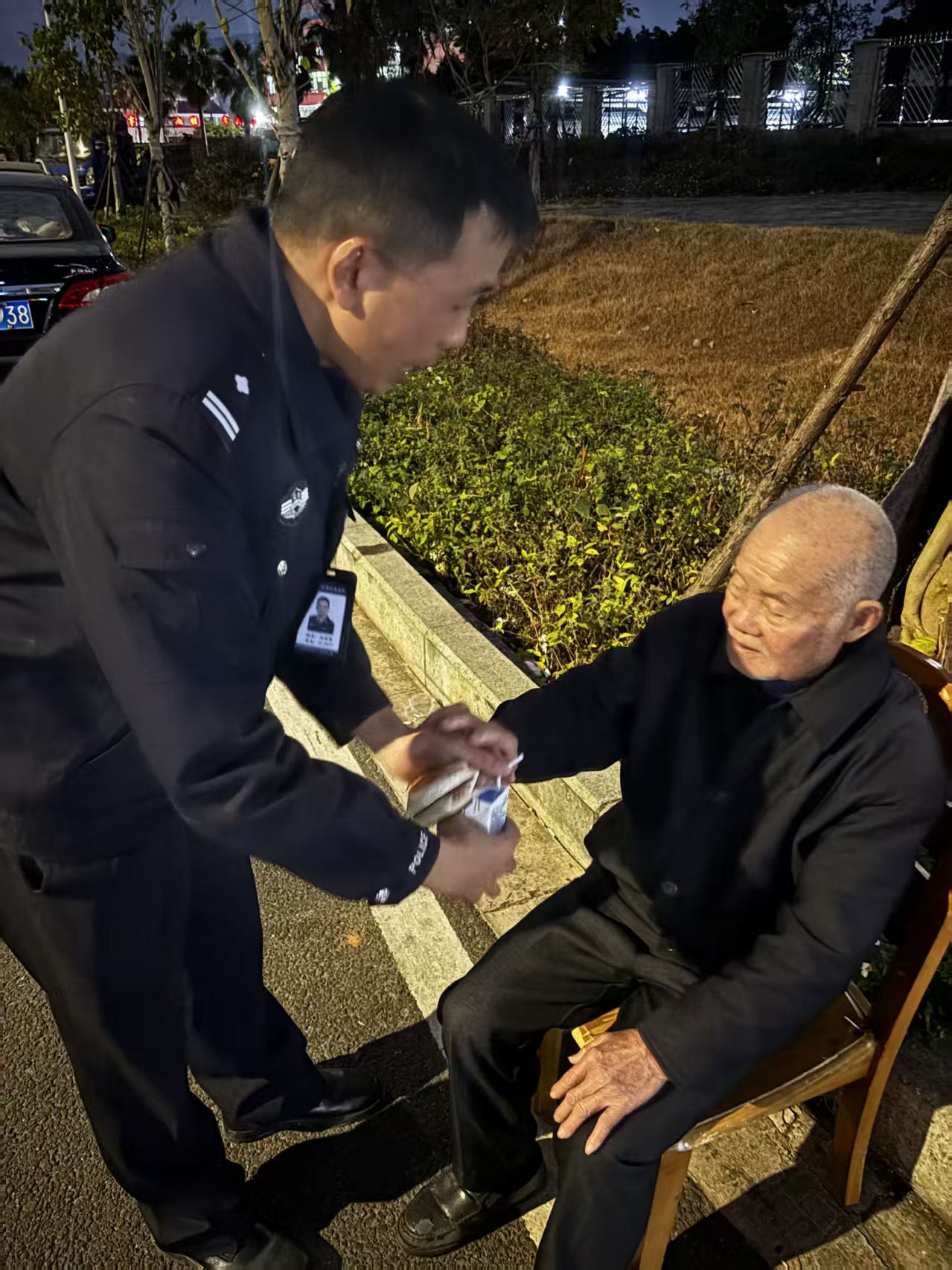 夜幕降临,寒风刺骨,吴林栋从车上取出面包和牛奶,递到老人手中,悉心照料老人补充能量。紧接着,他迅速联系辖区派出所,详细说明了老人年事已高、仅会讲当地老方言等重要信息。在等待支援的过程中,吴林栋始终守在老人身旁,用眼神、点头与简单比划安抚老人的不安,并借助纸笔,从老人模糊的发音中捕捉可能的姓名、地名谐音字,为后续身份核查留下了宝贵线索。