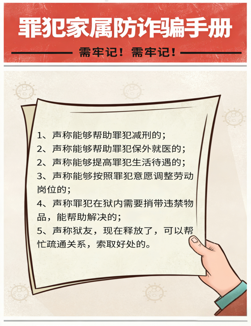 各位罪犯家属,如果您接到声称只要花钱找关系,就可以让您在监狱服刑的亲人、朋友“早点出来”的电话,那一定是诈骗!切勿相信!花钱买减刑这一想法不可取,多劝在监内服刑的亲人、朋友遵守监规、好好改造,用实际行动争取减刑才是正道。