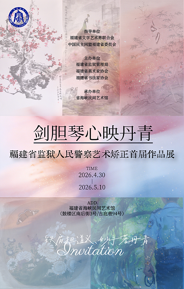 2026年4月30日至5月10日,“剑胆琴心映丹青”——福建省监狱人民警察艺术矫正首届作品展将在省海峡民间艺术馆举办。诚邀您走进省海峡民间艺术馆第一展区观展,近距离了解全省监狱民警队伍文化建设和教育改造工作成果。本次展出作品涵盖书法、美术、传统工艺美术等多个领域,全方位展示我省监狱人民警察践行“惩罚与改造相结合、以改造人为宗旨”监狱工作方针,扎根基层一线,用心用情做好罪犯教育改造工作的忠诚担当和职业情怀。